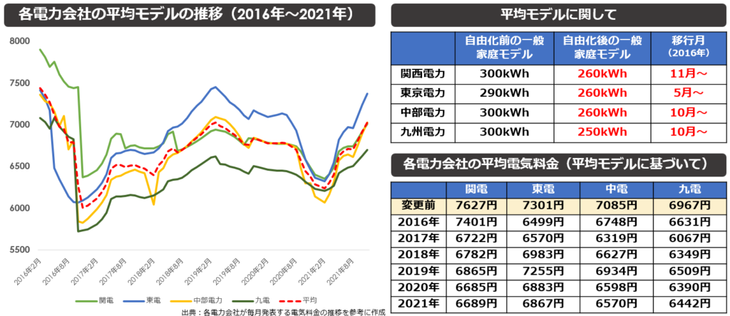 実際に各電力会社が毎月報告する電気料金の推移を参考に資料を作成しました。電力自由化前後で、各社が公表する一般家庭モデルが変更されたため、2016年直後では大幅に下落しているように見えます。しかし、資源エネルギー庁が発表しているように、変更後の2016年と比較すると、平均単価は上昇傾向にあることが読み取れます。