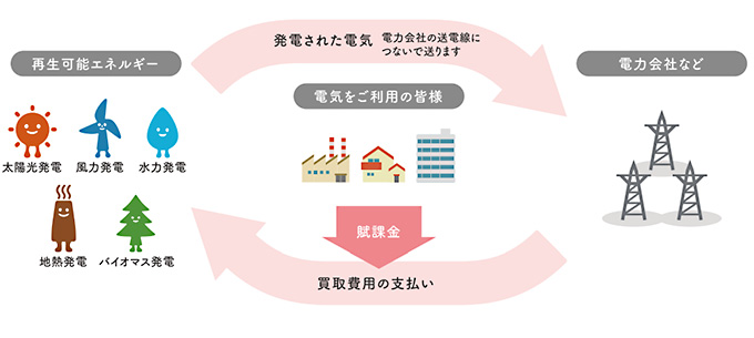 「(再生可能エネルギーの)固定価格買取制度」とは、再生可能エネルギーで発電した電気を、電力会社が一定価格で一定期間買い取ることを国が約束する制度になります。