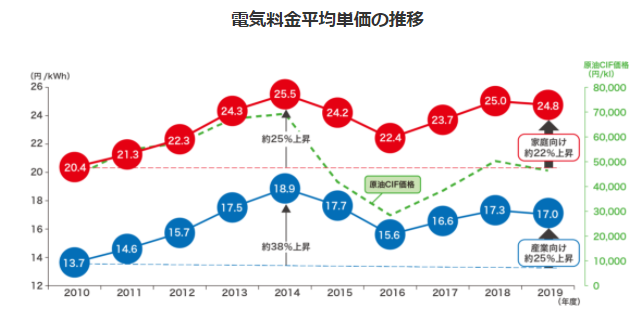 上図を見ると、東日本大震災以降、電気代平均単価は上昇していることが分かります。2014年〜2016年は下落傾向にありましたが、2017年から再び上昇傾向にあります。電力自由化前の2016年と2019年を比較すると、結果的にはなんと電気料金の単価は9%上昇しているのです。