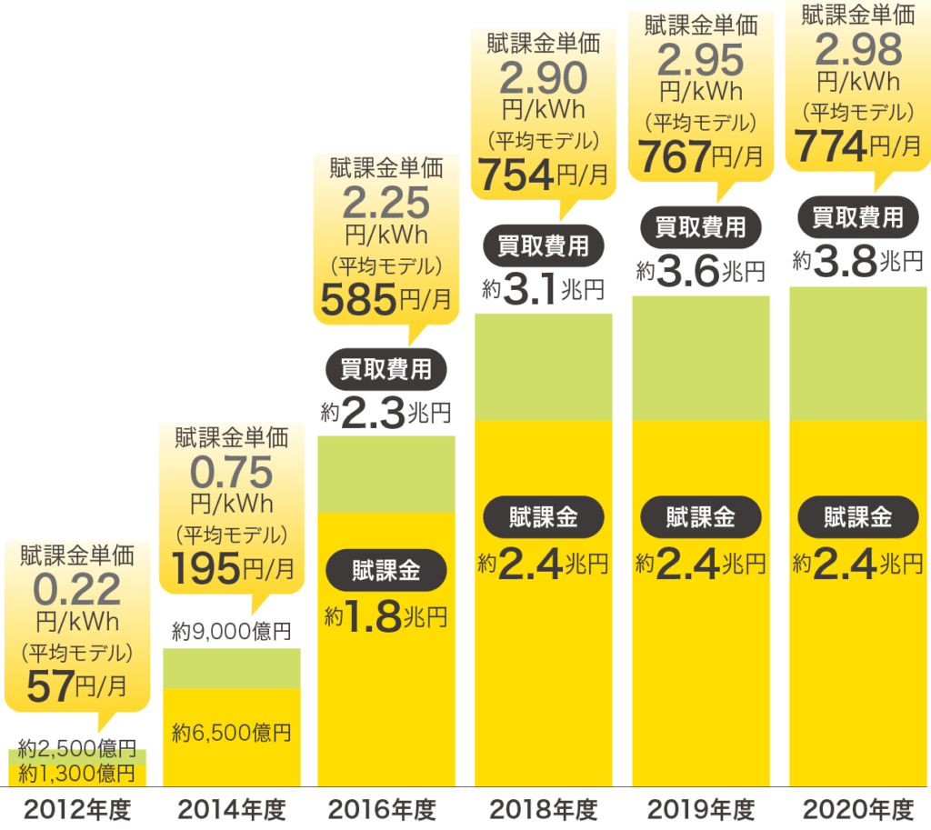 この上昇理由は、再エネ設備の導入が増加し、同時に買取費用もその分増加しているためです。