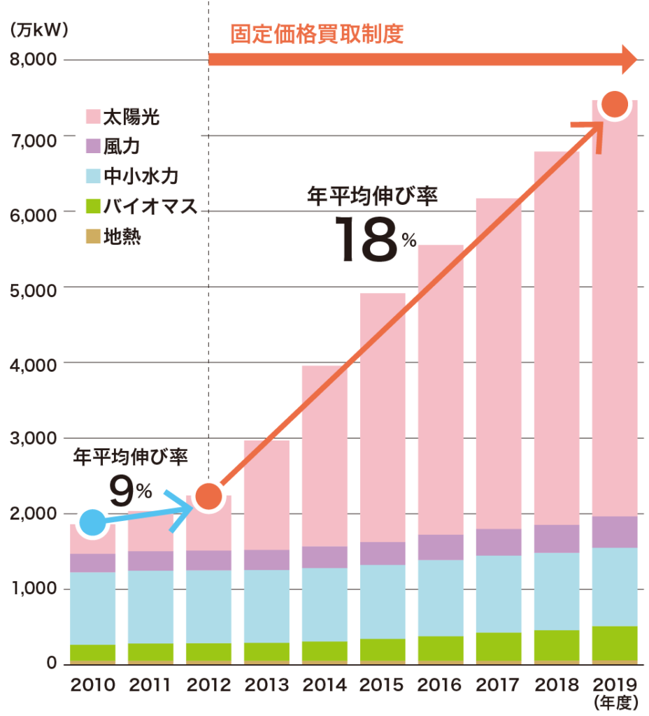 制度が施行された2012年以降、再エネの設備容量は上がり続けており、制度の効果が表れています。下記のグラフの通り、2012年以降の年平均伸び率は18%と右肩上がりです。