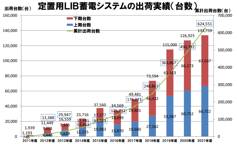 近年蓄電池が注目されている最大の理由としては、災害などで停電が起きても電気を使い続けることができるからになります。冒頭でもお伝えしたように蓄電池は「好きな時に電気を貯めて、必要な時に使う」ことができる機器になります。そのため、上述したような使い方をすることで電気代を削減すること以外に、万が一の停電時にバックアップ電源としても活用することができます。地震や台風といった自然災害が増加傾向にあることから、「命を守る保証機器」として導入される人が増えています。家庭用蓄電池の普及状況を見ると、その設置台数は導入開始から現在まで年々増加傾向にあります。下図は2021年度までの普及状況です。2022年以降も増加し続けると予想されます。