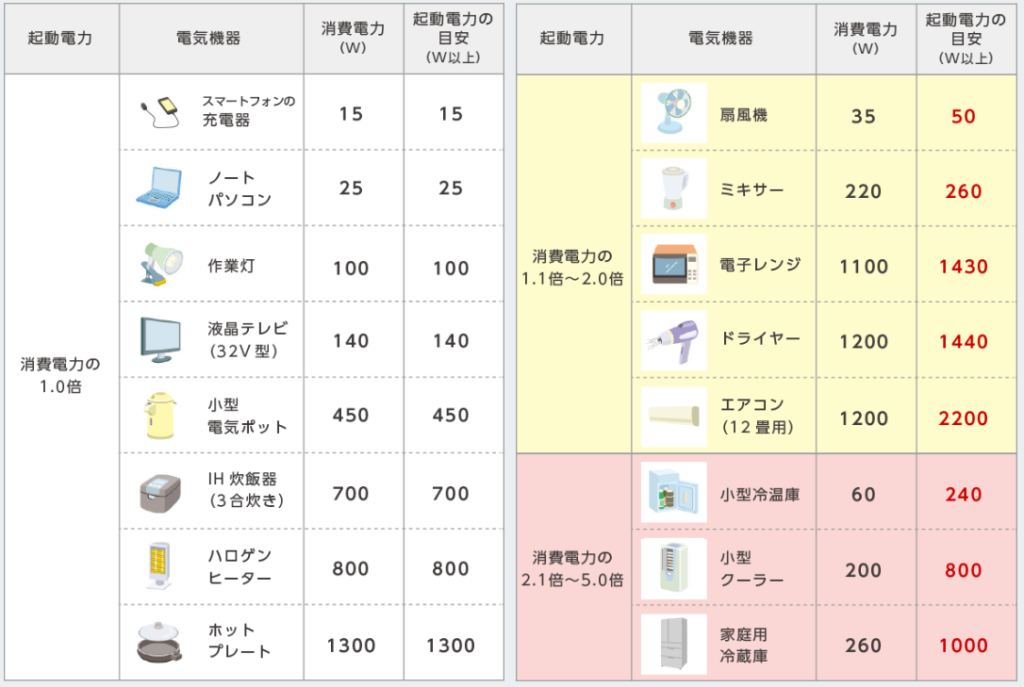 ここから分かるように、その蓄電池容量が大きければ大きいほど、また、消費電力が低いほど長時間電化製品を使用することができます。
