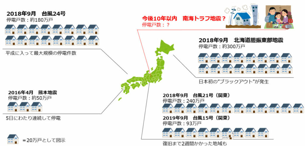 例えば、2018年にあった千葉県の台風21号ではその被害は大きく、約240万戸が停電しました。また、同年北海道では日本で初めて全域大規模停電(ブラックアウト)が発生しました。これにより北海道全域約300万戸が停電しました。今年で言うと、記憶に新しいかと思いますが、福島県沖の地震により震源地から離れている東京都でも300万世帯が停電になりました。今後は10年以内に南海トラフが起きると予想されているように大きな地震などが起きる可能性もあります。