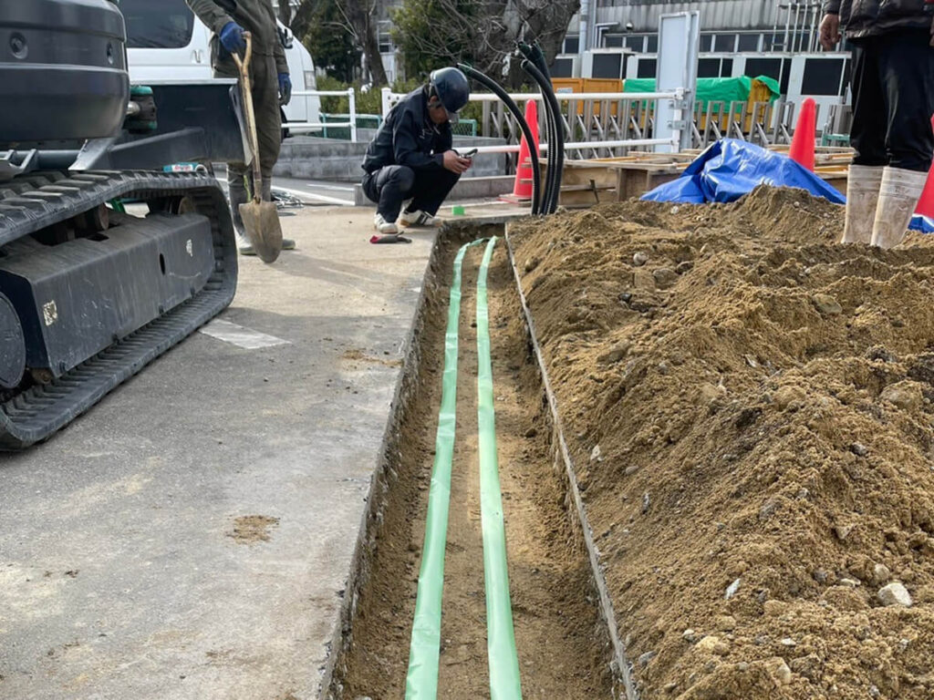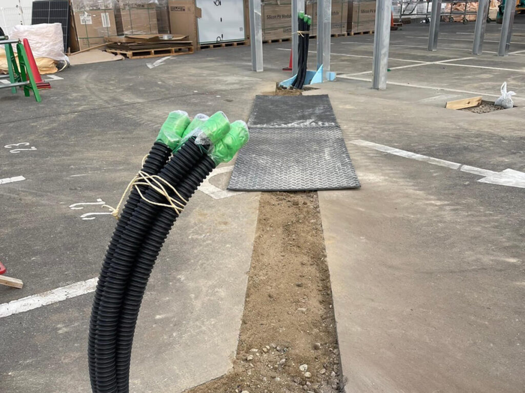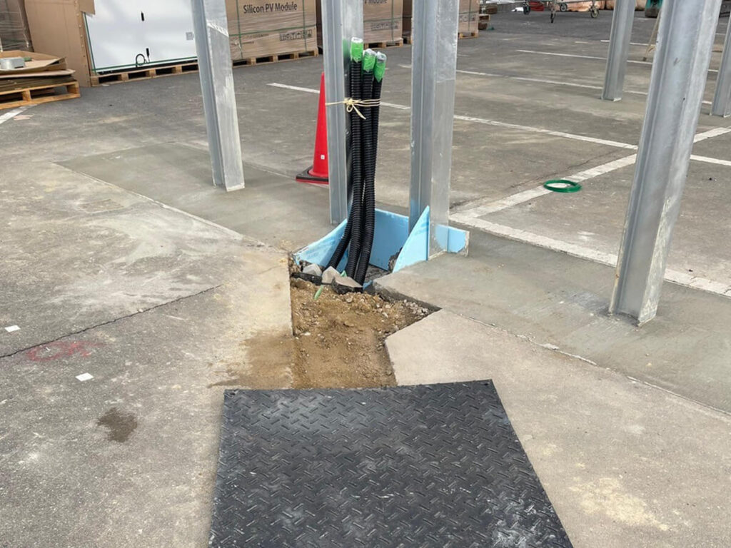 - 既設アスファルトを掘削、撤去し、PVケーブル、アース線を埋設配管にて配線
