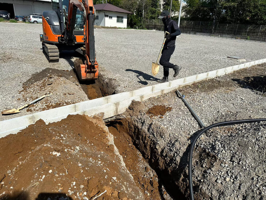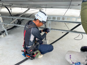 3. 架台にパネルを設置し、PVケーブル、アース線を埋設配管にて配線