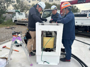 4. 直流ケーブルをPCSに接続、PCSからトランスへ交流幹線、アース線を配線