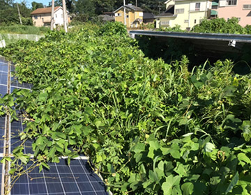つる草の繁殖力はとても強く、放っておくと支柱から架台レールをつたい、あっという間にパネルの表面を覆いつくしてしまいます。